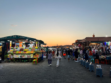 But the fun, the shock, the excitement was just getting started. We took the bus on the way into the city, since it was only 30 dirhams/MAD (10 MAD = 1 USD) round trip. The fifteen-minute bus ride took us through the outer city regions of Marrakesh, where we saw camels, crazy driving, and some really barren landscapes. As we neared the city, I spotted it. جامع الفناء, Jemaa el-Fnaa—the main square of Marrakesh, meaning literally "Assembly of the Dead." We got off the bus here. I was completely giddy in the moment. I had the largest grin on my face, my walk was borderline a skip, and I couldn't keep my excitement contained. I would soon learn that to appear excited around Jemaa el-Fnaa is how you end up attracting more people to get you to buy things. And I knew this, after all, I did spend two months in Paris, where, too, it is uncool to look like a tourist. But in the moment, I leaned into the "just a tourist" lifestyle. I thought that though I, of course, looked like an idiot tourist straight off the plane, that's exactly what I was. It was my right to be excited, and that later I would walk through the square with a stern look on my face, dismissing all the salesmen.