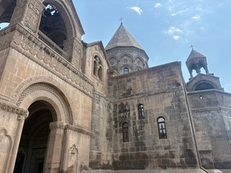 I made a few day trips out from Yerevan as well. The first one was back when Zack was still here, to the Etchmiadzin Cathedral: the oldest cathedral in the world, built in the early 300s. It still stands today, though of course renovated and restored. We visited on a Sunday during Mass, so I got to see the cathedral in full force. Like the other Armenian churches I’ve seen, Etchmiadzin is made of stone, though unlike the others, it’s ornately decorated on the inside. The church was recently redone, and all the artwork and patterns on the building were amazing. The domes were angular, steep, and grand, and the building looked so polished and clean.