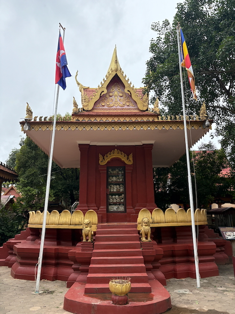We visited a killing field site in Siem Reap, which was incredibly depressing. Walking around, this site is now a temple, with golden shrines much like those of Thailand, but instead of one large shrine, they’re several small shrines. But you’d come across a well where they’d throw bodies into after shooting them. Or they had a mass grave excavated on display. But most chilling was the bone shrine. In the main structure of this shrine was piles and piles of bone on display, contrasting sharply with the dark reds and bright golds in the rest of the shrine. It was placed so nonchalantly—there was little attention paid to it, just a sign stating that the bones are of those who were killed there. It shows the numbness to death that Cambodia went through in that time.